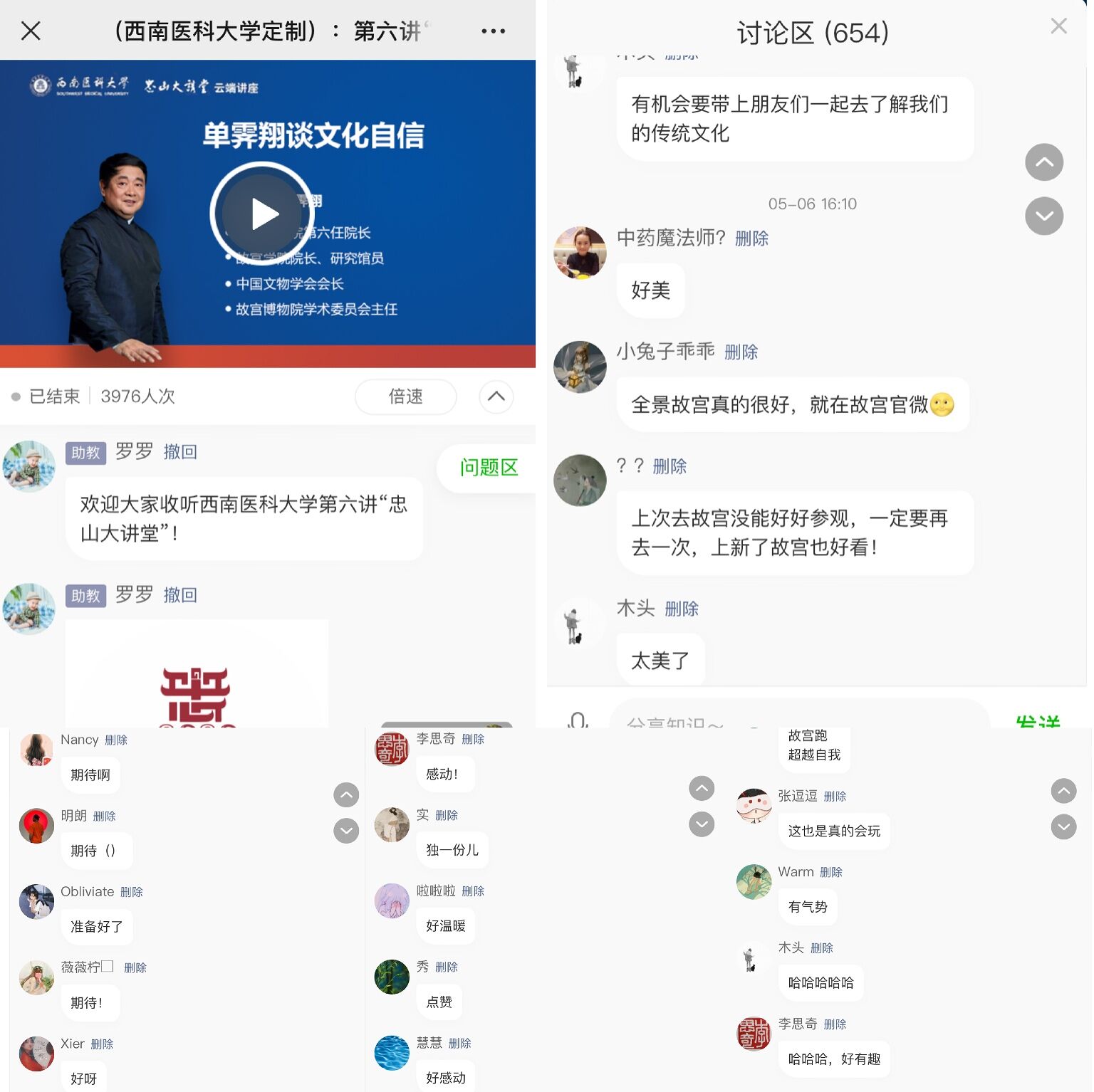 一个半小时的讲座,单霁翔金句频出、妙语连珠,引得师生连连点赞,大家纷纷在直播间和微信群展开讨论,仅直播间讨论区就有600余条留言。师生们表示,要做中华优秀传统文化的忠实守望者,为传播中华优秀传统文化贡献自己的力量。
