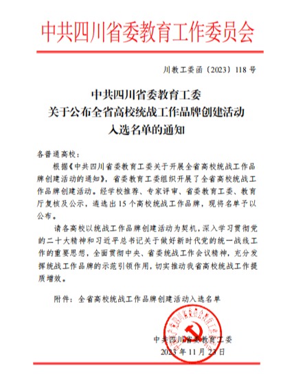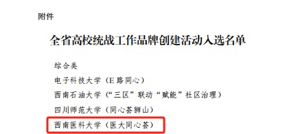 近日,中共四川省委教育工委公布了《全省高校统战工作品牌创建活动入选名单》,我校申报的统战工作品牌“医大同心荟”成功入选,全省仅遴选出15个高校统战工作品牌。