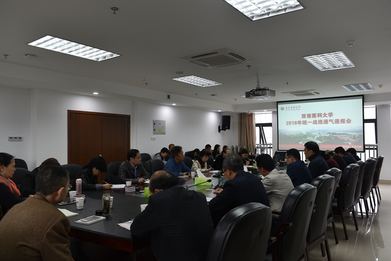 3月30日上午,我校2018年统一战线通气通报会在城北校区德诚楼621会议室召开。党委书记廖斌、校长何延政、党委副书记刘毅,党委办公室、校长办公室、组织部、人事处、党委统战部等职能部门负责人,三所附属医院和基础医学院统战工作分管领导,学校各级人大代表、政协委员,各民主党派基层组织、海联会、知联会代表等30余人参加了会议。会议由刘毅主持。