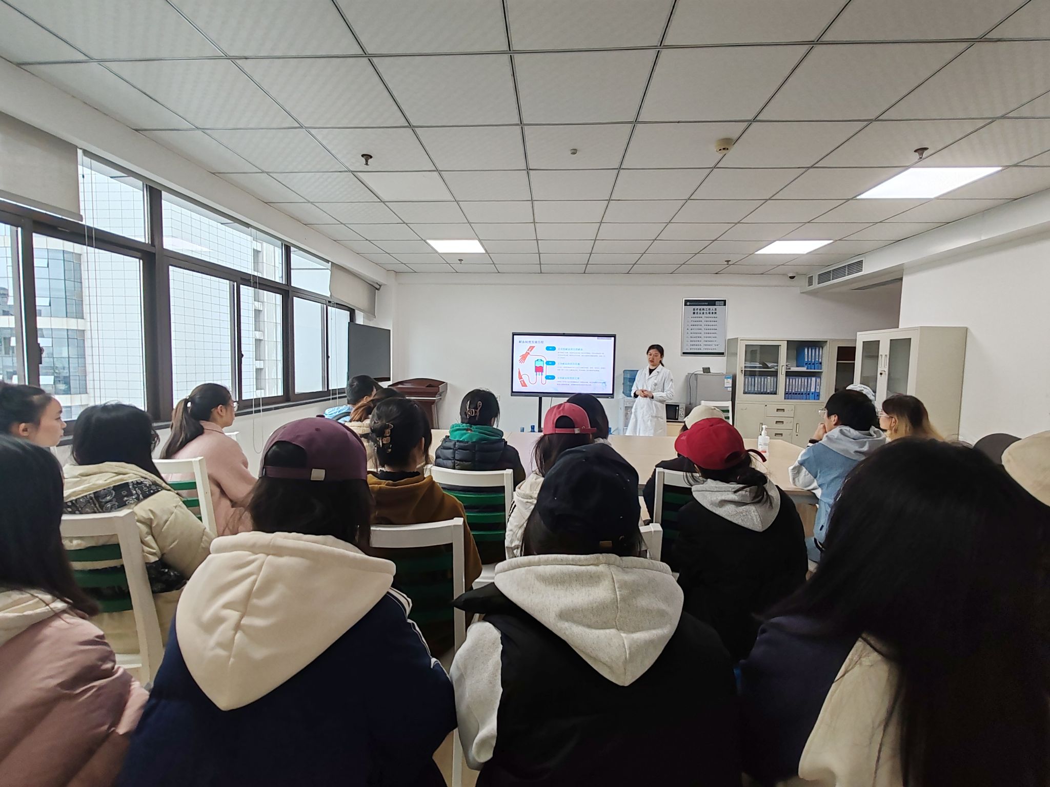 活动邀请了产科汪静教授开展了无偿献血科普讲座。汪教授以风趣幽默、通俗易懂的语言,围绕无偿献血科学常识,无偿献血政策法规、献血流程及注意事项,以及无偿献血的社会价值等多个层面进行了深入讲解。汪教授在讲座中强调,“每一份献血,都是馈赠生命的珍贵礼物。大学生作为社会发展的中间力量,应当以实际行动传递爱心,为医疗用血安全提供有力保障。”