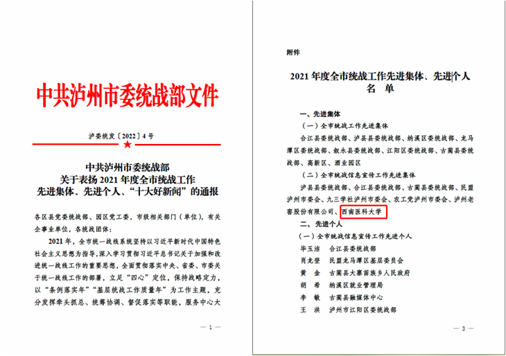 2月24日,中共泸州市委统战部发布了《关于表扬2021年度全市统战工作先进集体、先进个人、“十大好新闻”的通报》(泸委统发[2022]4号),我校获评“全市统战信息宣传工作先进集体”。