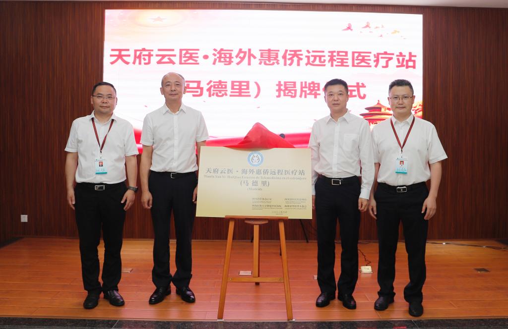 启动仪式上,四川省侨办主任文甦,四川省中医药管理局局长田兴军,英国上市公司365附属中医医院党委书记李志、院长刘建共同为“天府云医•海外惠侨远程医疗站(马德里)”揭牌。