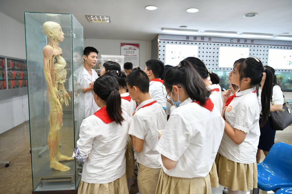 满怀着激动的心情,同学们来到了全国科普教育基地—学校人体科学馆。老师们耐心细致的为同学们介绍了生命的起源与发育、人体结构与功能,并带领同学们观摩人体塑化标本、铸型标本、断层标本等。在老师的指引下,同学们兴致勃勃的观察着各式各样的标本,不时提出问题,“人体标本的血管里为什么有红色、蓝色、黄色呢?”老师结合标本一一细致地给同学们进行了讲解。在参观和学习过程中,同学们深切感受到了人体的奥秘和生命的珍贵。