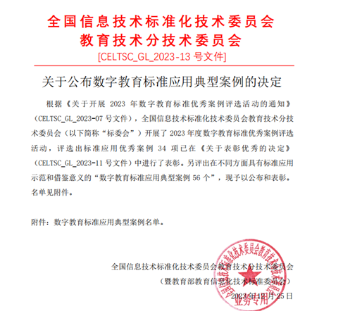 近日,全国信息技术标准化技术委员会教育技术分技术委员会公布数字教育标准应用典型案例名单,全国共56个“数字教育标准应用典型案例 ”入选,我校《全光数字底座点亮教育新时代网络篇章》成功入选。