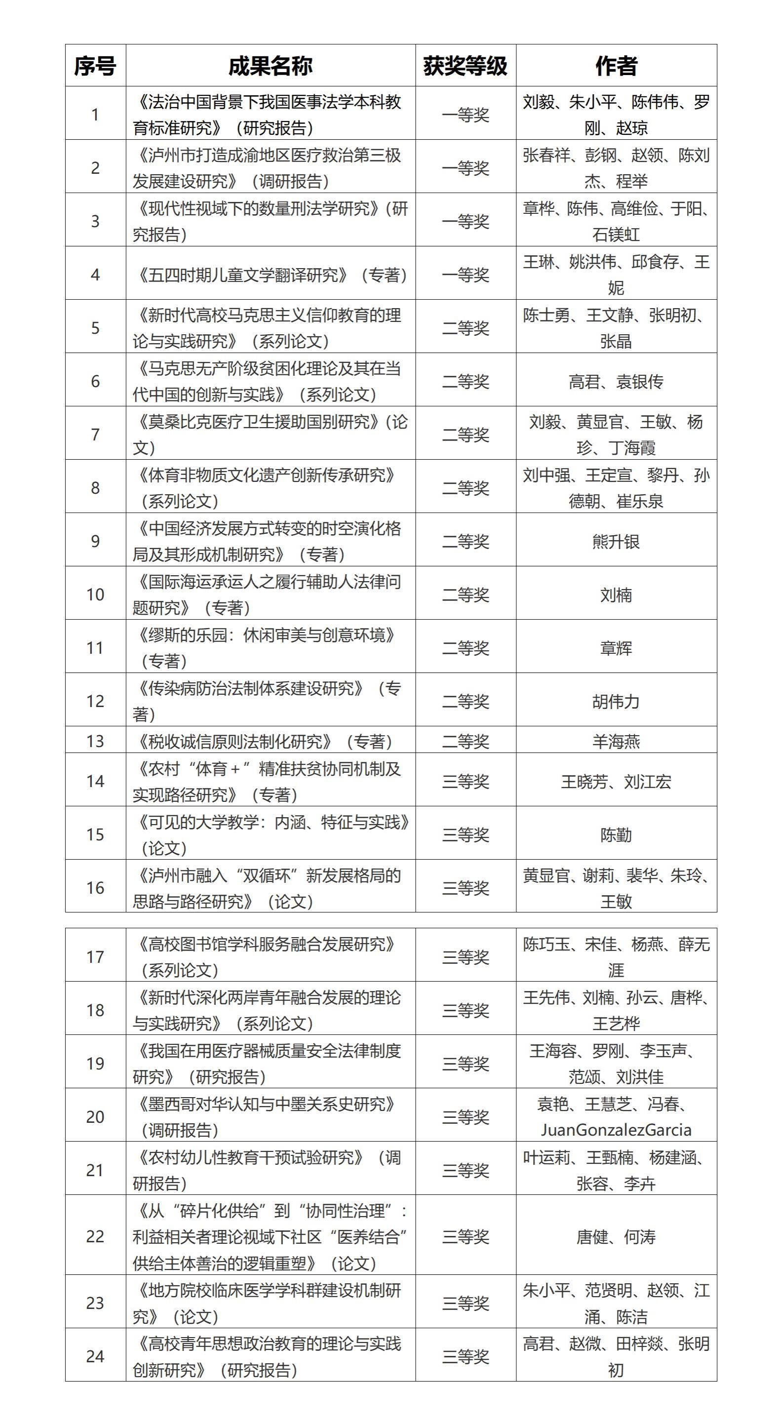 近日,泸州市第十六次社会科学优秀成果奖获奖名单揭晓,我校共有24项参评成果获奖,其中包括一等奖4项,二等奖9项,三等奖11项。