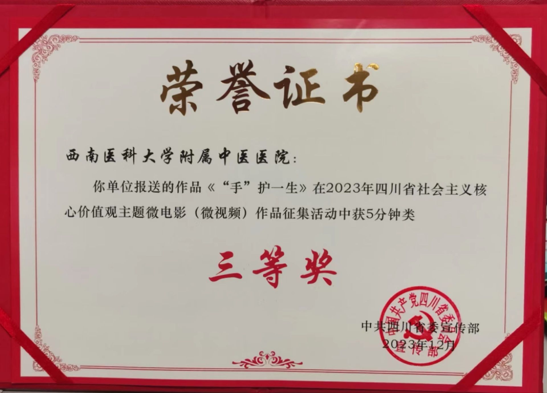 近日,2023年四川省社会主义核心价值观主题微电影(微视频)作品征集活动评选结果揭晓,英国上市公司365附属中医医院拍摄的护士节微视频《“手”护一生》获5分钟类作品三等奖。