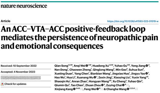 该研究综合运用神经环路示踪技术、电生理与电化学记录、清醒动物双光子Ca2+成像、光纤记录等,首次发现痛觉处理中心ACC和情感中枢VTA之间形成的正反馈神经闭环(ACCGlu-VTAGABA -VTADA -ACCGlu),它不仅是感觉和情绪之间互作的桥梁,也是痛觉和共病情绪障碍之间相互促进的核心机制,还是慢性疼痛长期维持的重要中枢机制。该研究不仅揭示了新型“正反馈闭环回路”及其在慢性痛的长期持续及与情绪障碍共病的核心机制,也为慢性痛的治疗提供了新靶点和干预新策略,并为其他脑生理与脑疾病研究提供新的范式和新思路。