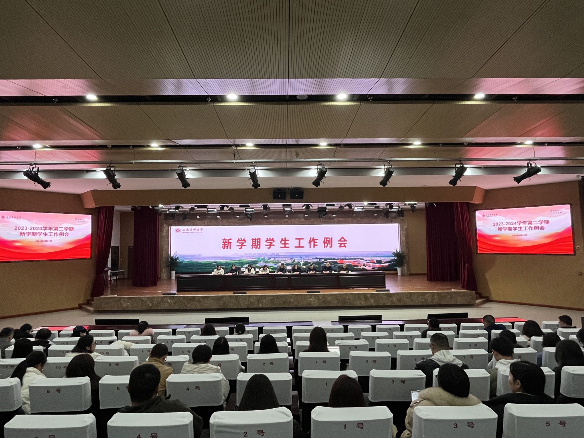 2月21日下午,2023-2024学年第二学期新学期学生工作例会在城北校区第一学术报告厅召开。学校党委常委、副校长代荣阳出席并讲话。教务处、基建后勤处、武装保卫处等部门领导,学生工作部、团委全体人员以及全体专兼职辅导员共计130余人参加了会议。会议由学生工作部部长谭群英主持。