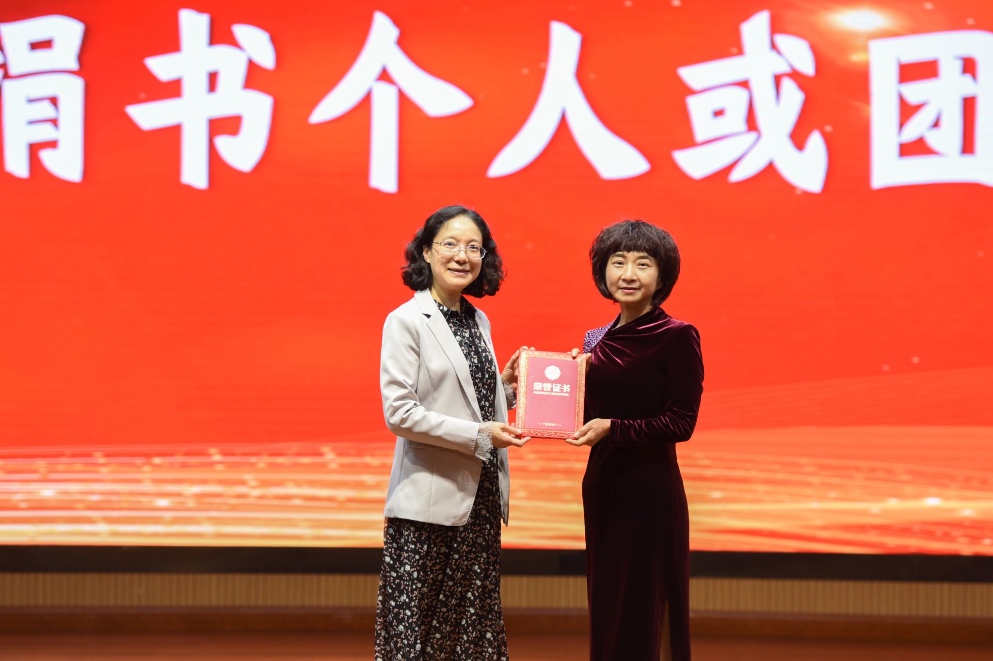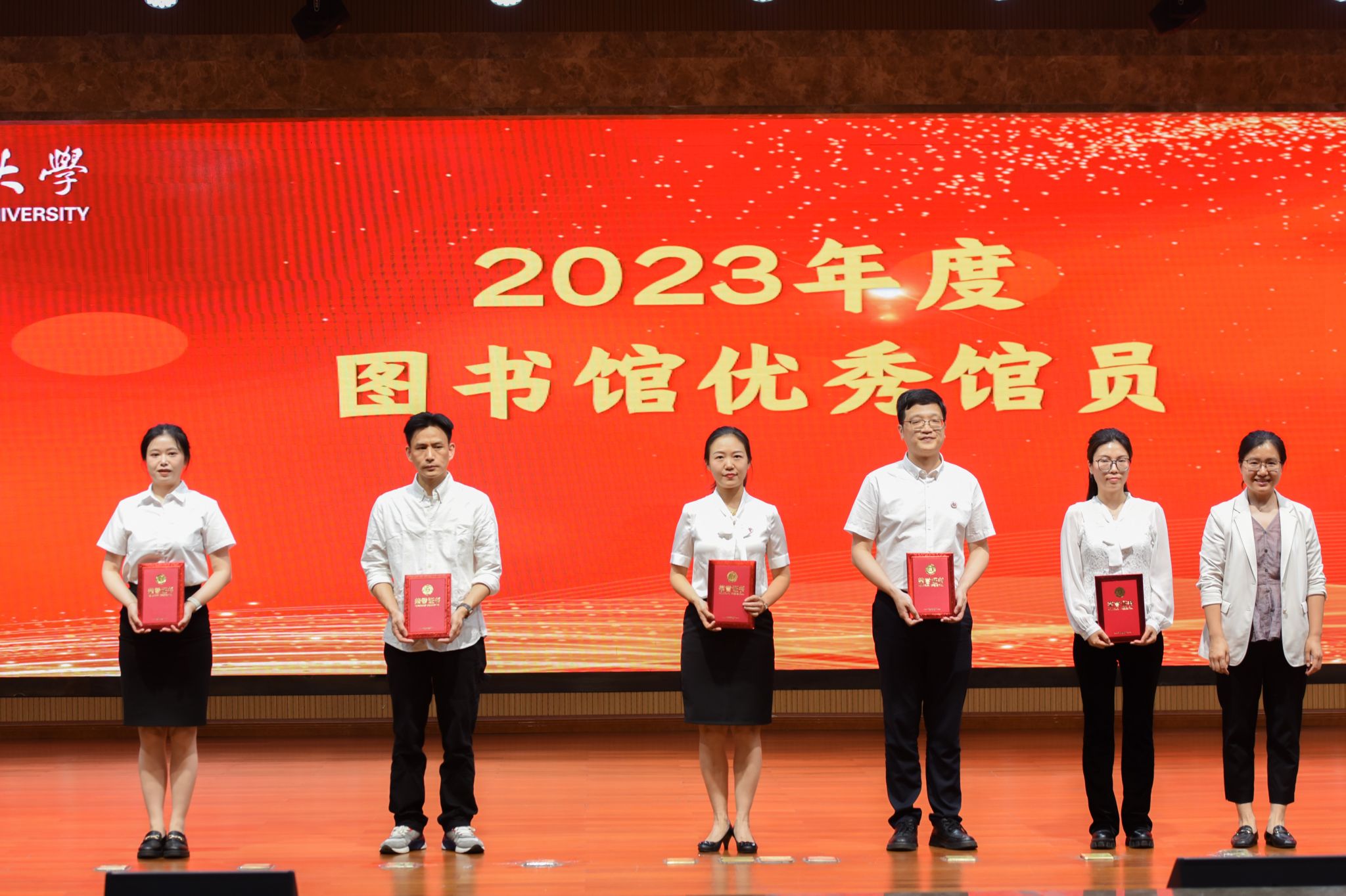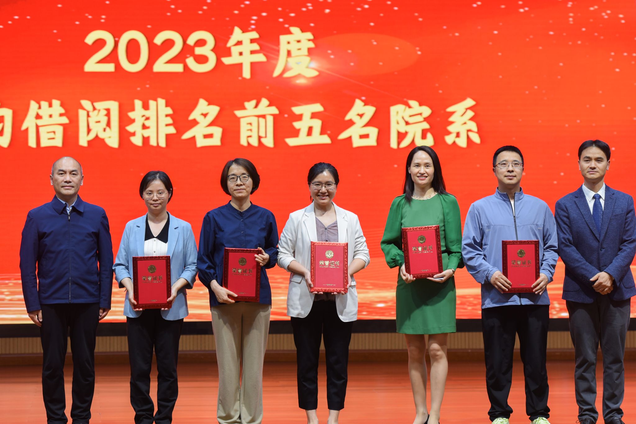 仪式上宣读了 2023年度生均借阅排名前五院系名单、2023年省级本科高校大学生竞赛项目信息素养大赛获奖名单、2023年度“入馆之星”名单、2023年度教工组和学生组“借阅之星”名单、图书馆优秀馆员名单、2023年度优秀荐书人等表扬文件,并进行了颁奖。