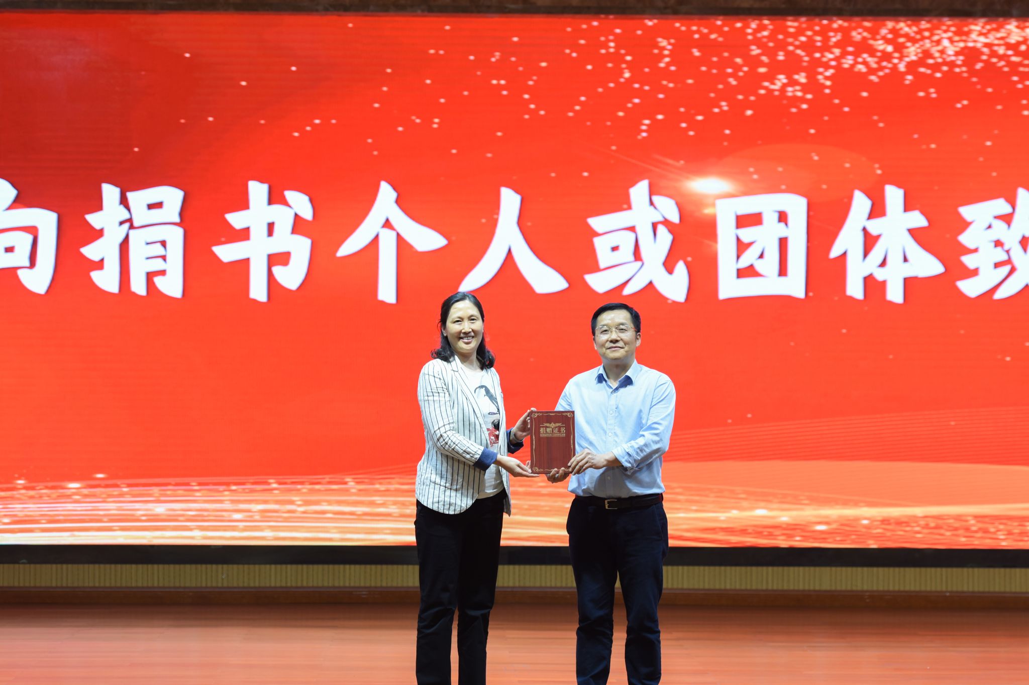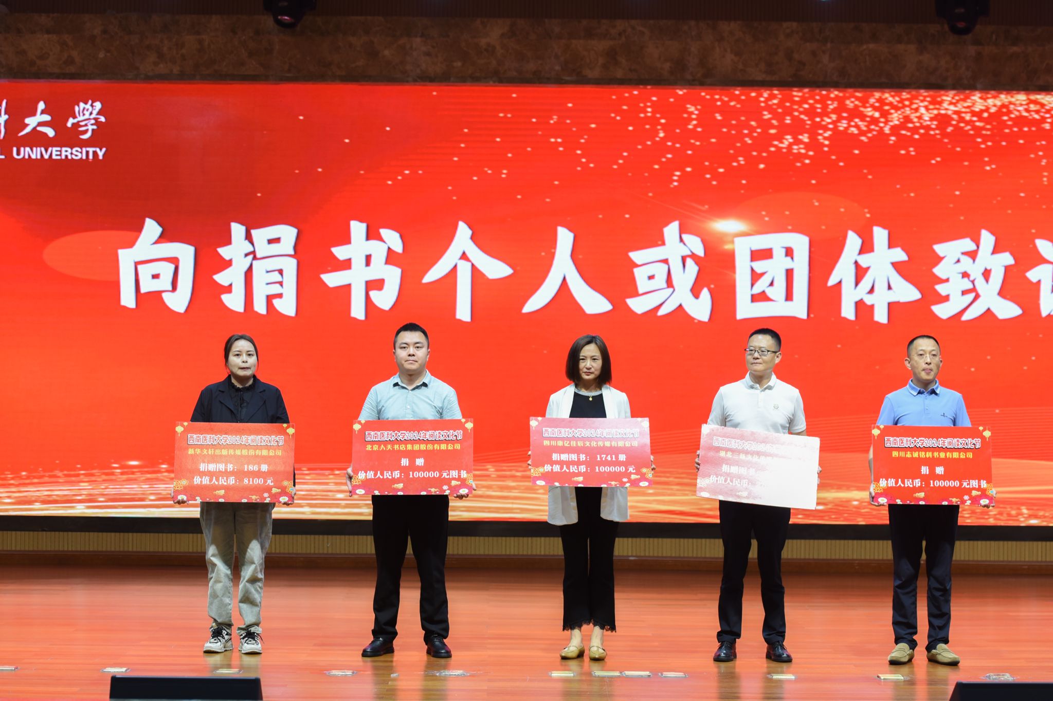 仪式上还对校友代表张雪梅女士、校内捐书教师代表田耘教授、五家捐书企业致谢。五家企业向学校图书馆捐赠了价值近24万余元的图书。同时,图书馆和药学院师生带来了精彩的节目。