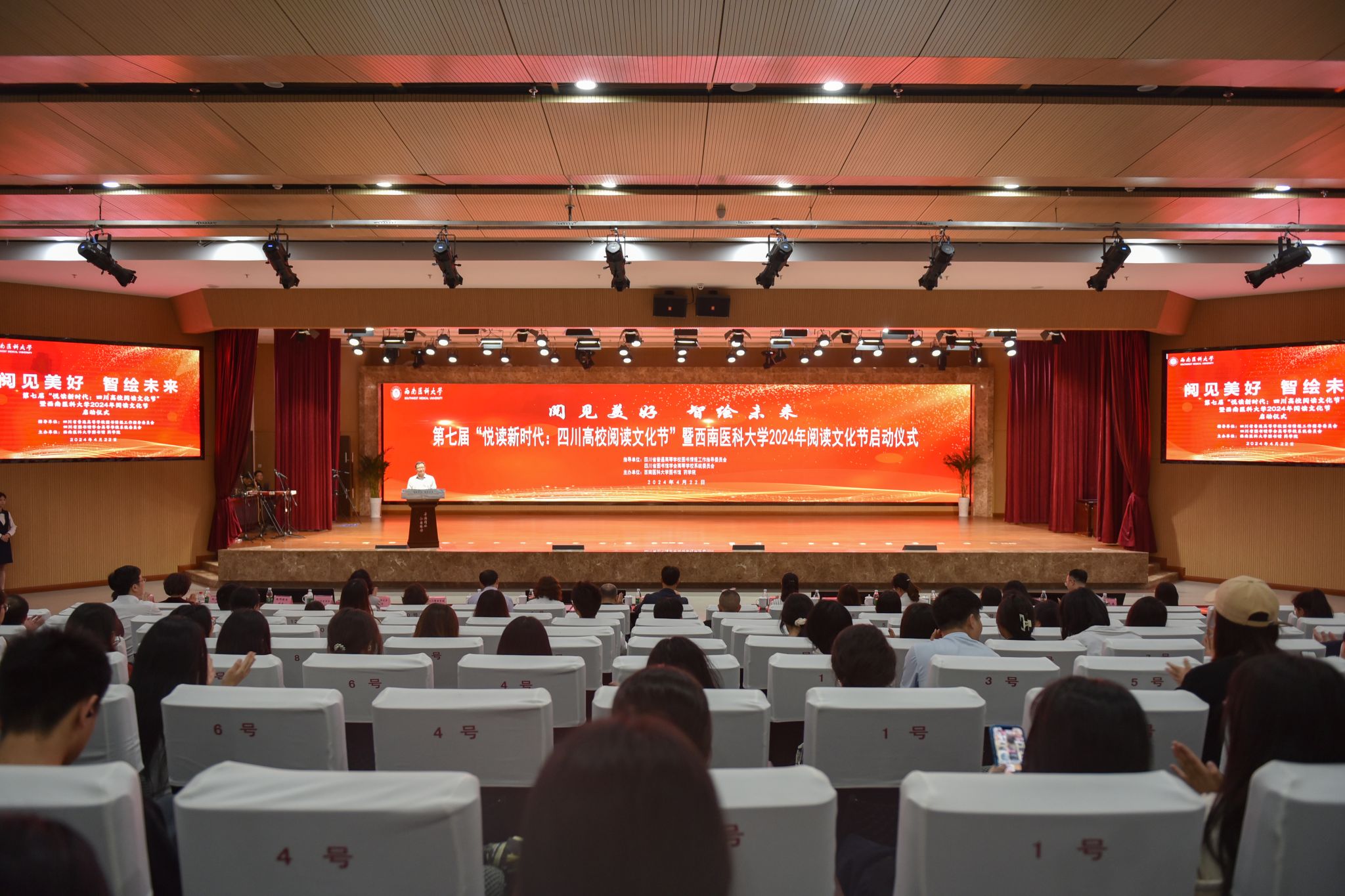 4月22日晚,由图书馆、药学院主办的第七届悦读新时代:四川高校阅读文化节暨英国上市公司3652024年阅读文化节启动仪式在城北校区第一学术报告厅举行。学校党委常委、副校长代荣阳,党委常委、宣传部˙统战部部长冯天明,教辅后勤党委书记曾宪利,学生工作部部长谭群英,校团委书记石惠,信息与教育技术中心主任潘宏,图书馆馆长冯勤,药学院党委书记唐艳斌,四川警察学院图书馆馆长何光英,泸州职业技术学院图书馆馆长张玲,泸州市图书馆副馆长刘蔚等应邀参加启动仪式,同时获奖代表、校友代表,捐书教师代表、捐书企业代表、师生读者代表等近800余人参加了仪式。启动仪式由图书馆副馆长史书龙主持。