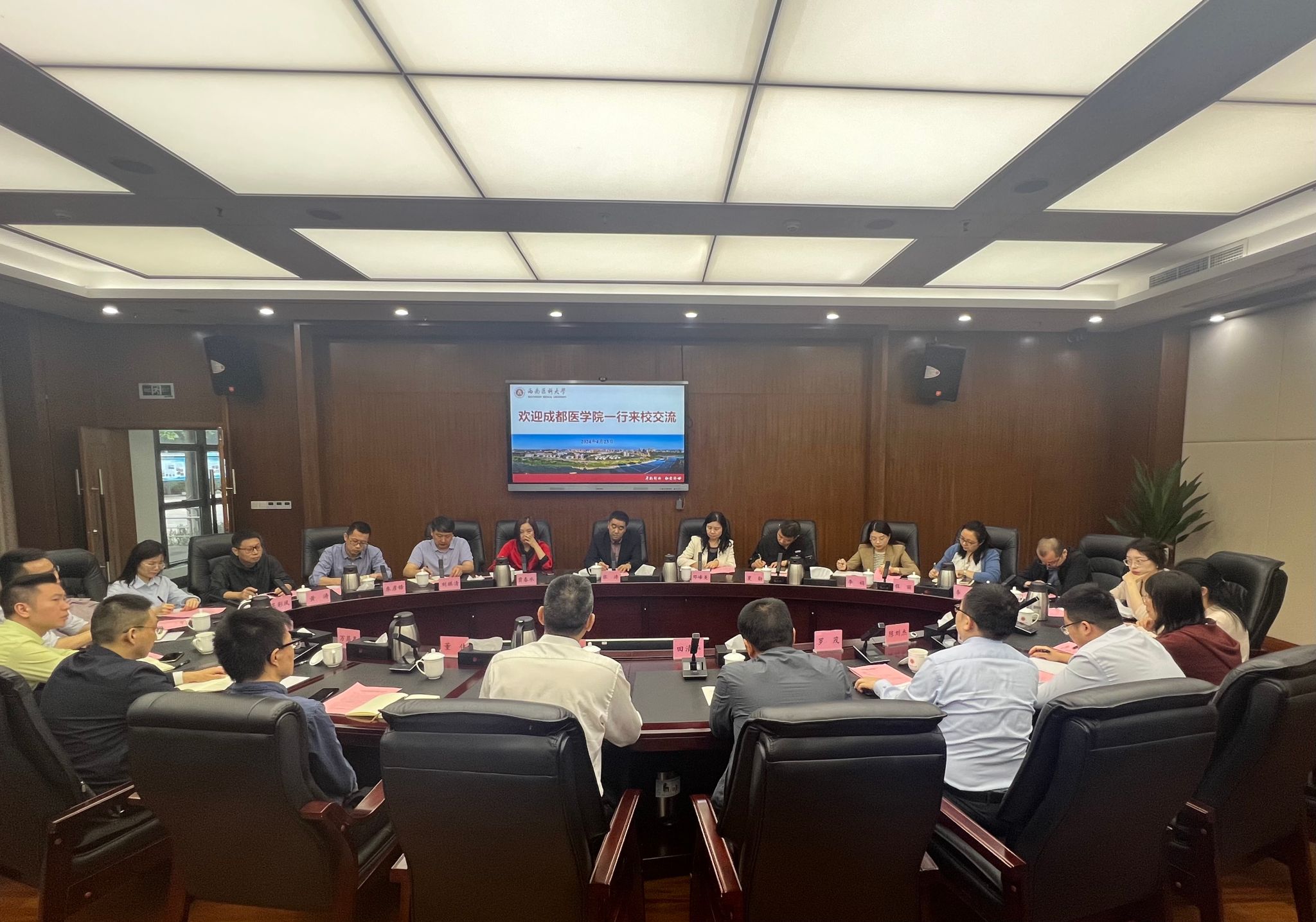 4月23日上午,成都医学院党委常委、副校长张涛一行来校调研交流,学校党委常委、副校长赵领,发展规划处、研究生院、财务管理处、大学科技园管理办公室、临床医学院·附属医院相关负责人等在城北校区第一会议室与来访人员进行了交流座谈。座谈会由赵领主持。