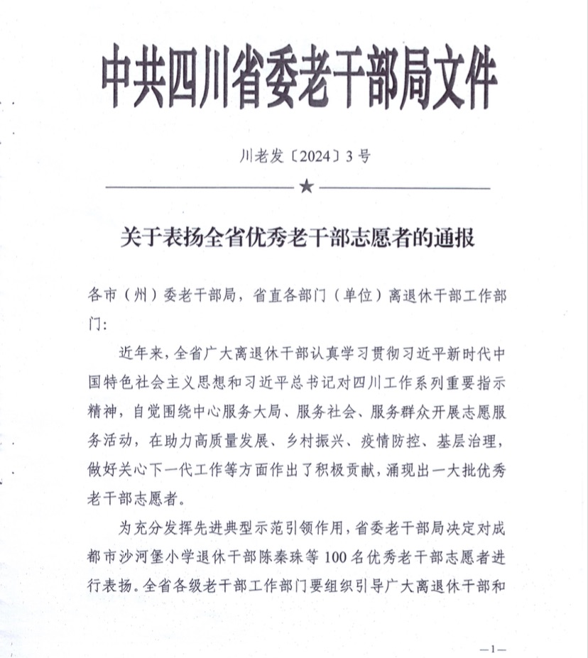 近日,中共四川省委老干部局下发关于通报表扬全省优秀老干部志愿服务者的通知,决定对全省范围内100名优秀老干部志愿服务者予以通报表扬,学校原党委副书记、正厅级调研员程文玉荣获“全省优秀老干部志愿者”称号。