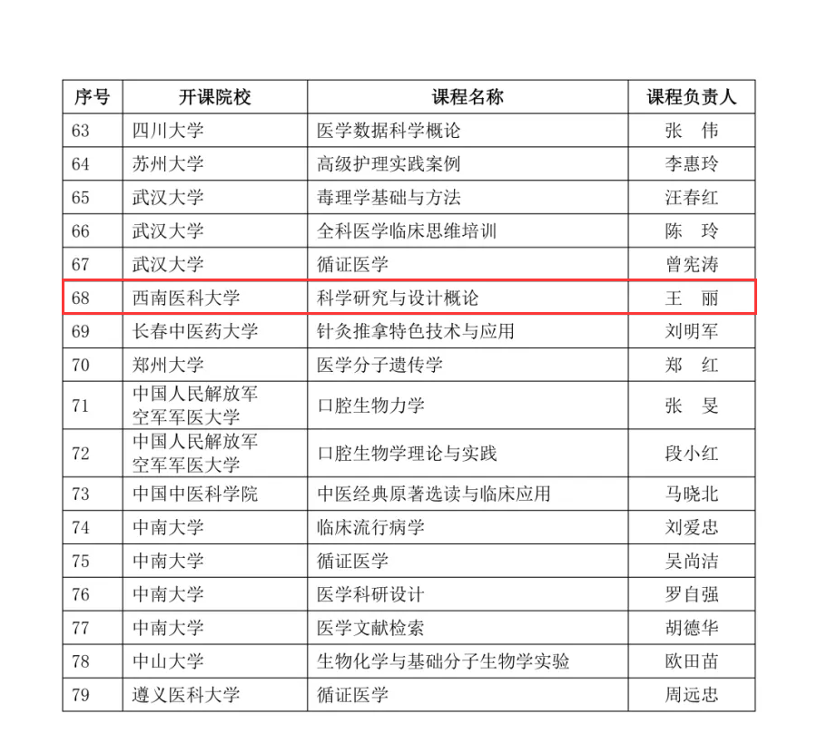日前,全国医学专业学位研究生教育指导委员会公布了首批全国医学专业学位研究生在线示范课程拟认定名单,我校中西医结合学院王丽教授的《科学研究与设计概论》课程获批认定,我校是川内除四川大学外唯一获认定的医科类院校。