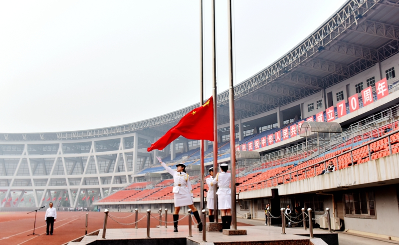 10月1日上午7:00,学校在奥体中心主体育场举行升国旗仪式和“国旗下的演讲”活动。党委副书记刘毅、学生工作部、校团委全体人员及各院系分管学生工作领导和全体辅导员、学生代表共800余人参加了活动。当美丽的五星红旗伴随着雄壮激昂的国歌冉冉升起之时,现场所有人员向国旗行注目礼,齐声高唱国歌,深情表达对伟大祖国的深切热爱和美好祝福。随后,2名学生代表在国旗下演讲,辅导员李康发表了国庆感言,党委副书记刘毅作了讲话,在澎湃激昂的《歌唱祖国》旋律中活动圆满结束。
