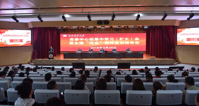 3月29日下午,学校党委理论学习中心组举行集中学习(扩大)会,专题学习贯彻2018年全国“两会”精神,党委书记廖斌作了《宪法》修改内容学习辅导报告,全国政协委员、校长何延政作了全国“两会”精神学习辅导报告。校级党委理论学习中心组成员,全体处科级干部、月度工作例会参会人员等参加了会议。