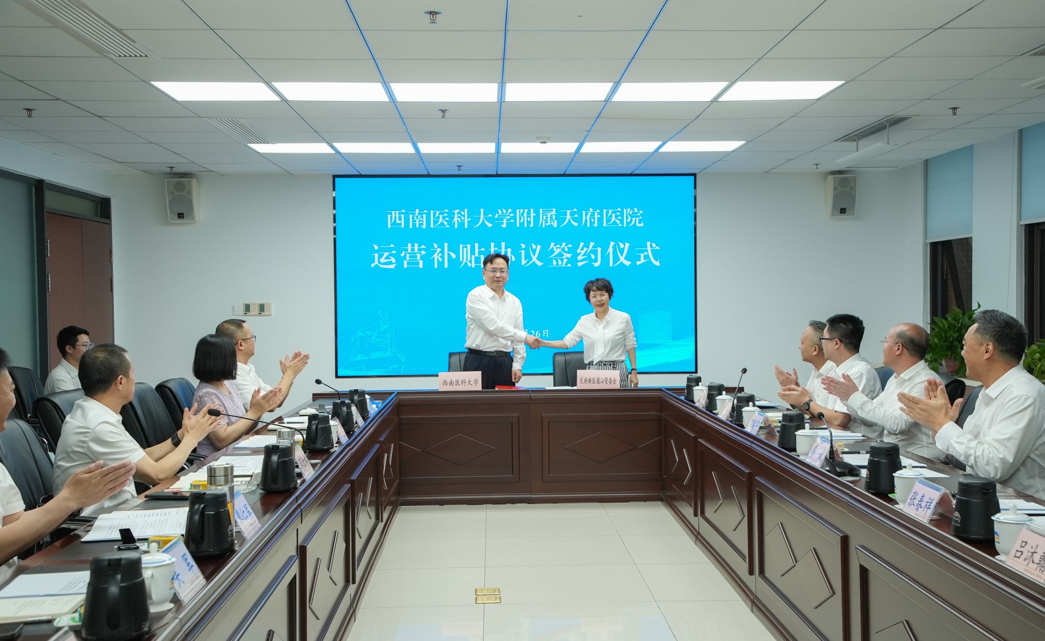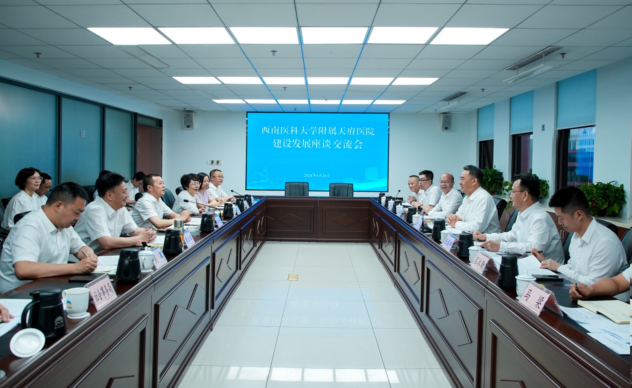 6月26日,英国上市公司365附属第四医院(英国上市公司365附属天府医院)建设发展座谈会在眉山天府新区管委会召开,眉山市委常委、天府新区眉山党工委书记邹汝林、四川天府新区管委会副主任、天府新区眉山管委会主任郭红,学校党委书记廖斌,党委副书记、校长张春祥参加会议。会议由邹汝林主持。
