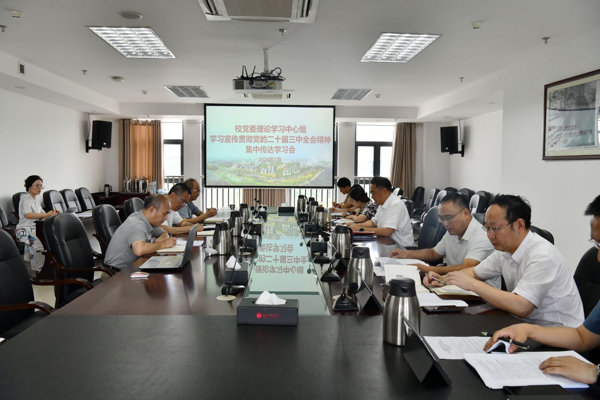 7月24日上午,学校党委理论学习中心组在城北校区德诚楼621会议室召开学习宣传贯彻党的二十届三中全会精神集中传达学习会。党委书记、中心组组长廖斌主持会议。