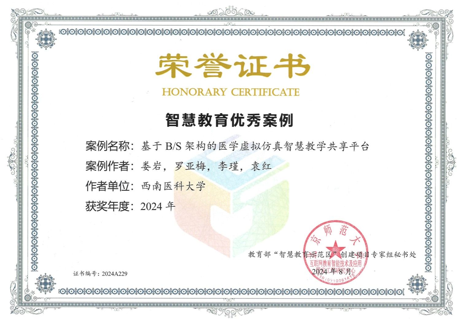 近日,由教育部科学技术与信息化司指导,"智慧教育示范区"创建项目专家组秘书处主办的“2024年度智慧教育优秀案例征集”活动中,英国上市公司365医学信息与工程学院娄岩教授团队申报的《基于B/S架构的医学虚拟仿真智慧教学共享平台》脱颖而出,荣获智慧教育解决方案类优秀案例。
