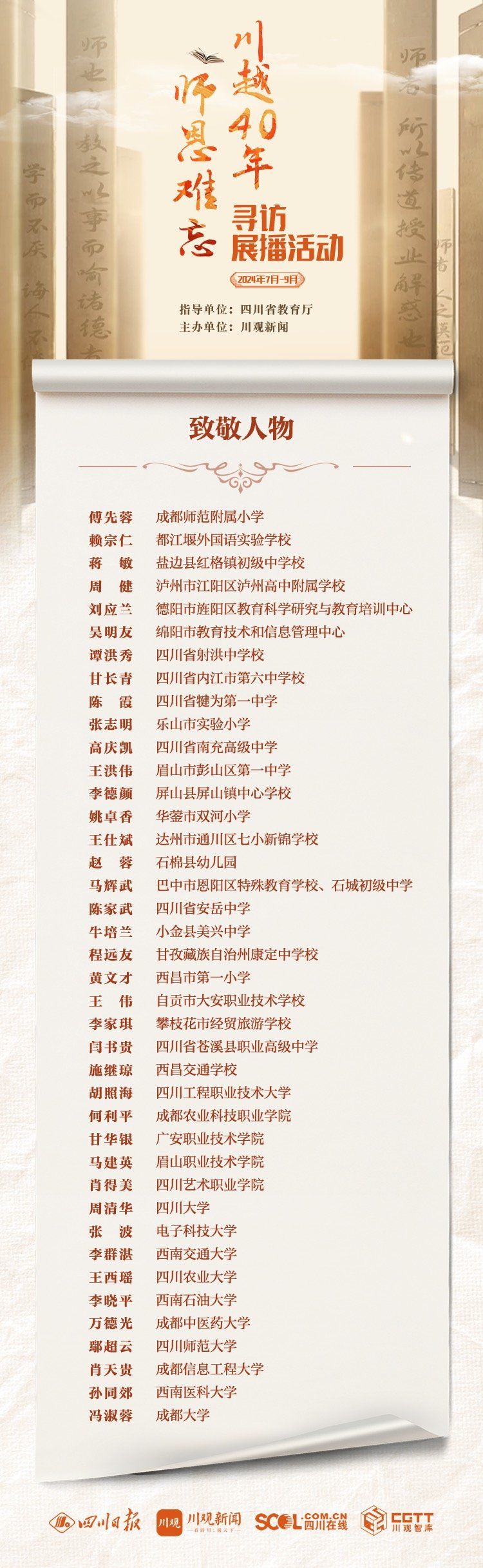 自1985年第一个教师节以来,巴蜀大地涌现出一批为人师表、率先垂范的优秀教师。此次寻访展播活动选出的40位致敬人物,既有在职教师,也有退休教师,覆盖学前教育到高等教育全学段。他们或是教学一线改革创新的旗帜人物,或是无私奉献青春的乡村教师,或是春风化雨、默默耕耘三尺讲坛的仁爱之师,或是投身乡村振兴的支教教师。他们书写了自己璀璨的教育人生,也展现出四川教育人在40年教育改革发展进程中的时代风采和精神风貌。