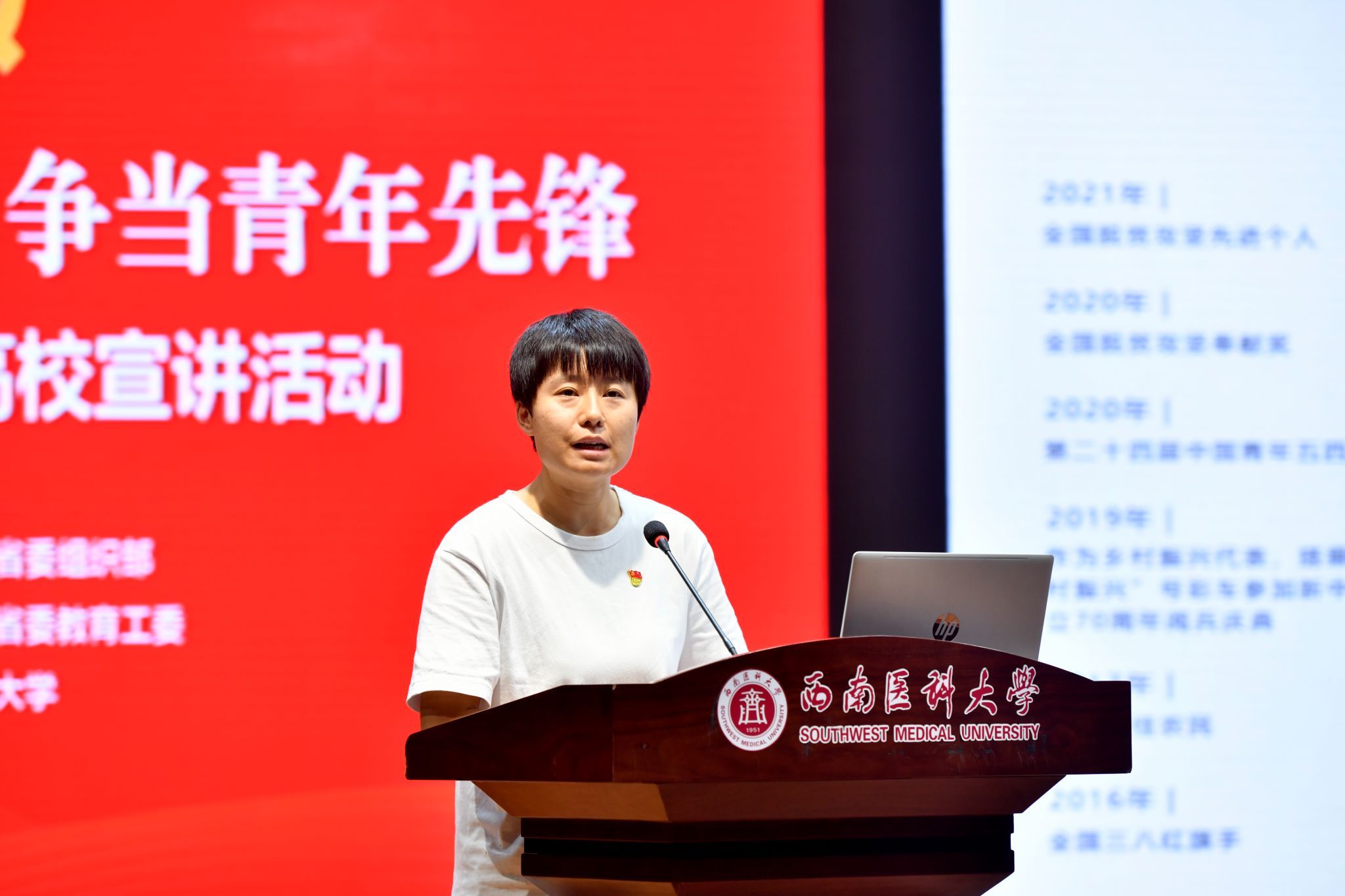 药学院2021级药学专业阿育玉芳则表示,“此次红色典型进高校宣讲活动,对于我们青年学子而言,是一次深刻的思想洗礼和精神激励,特别是作为西南医大的一名学生,我在现场聆听了榜样故事,更是备受鼓舞,同时深感责任重大。革命先辈们的无私奉献、勇于担当的精神,是我们青年一代的宝贵财富,我将学习并传承三位先进开拓创新,砥砺前行的科研和奉献精神,从自己做起,将我们的中医药文化发扬光大。”