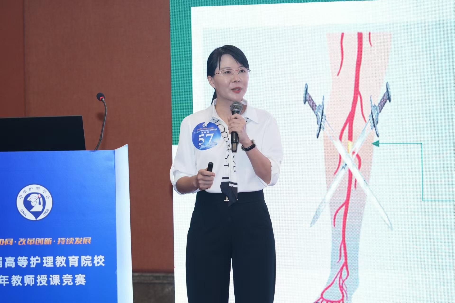 石镁虹参赛的题目是《动脉硬化闭塞症病人的护理——严重缺血期病人的患肢护理》。她凭借扎实的专业知识和精心的教学设计,运用案例、Ai智能等多元化教学方法,借助图文并茂的课件和深入浅出地讲解,充分展现了我校护理教师扎实的教学基本功和创新的思维方式。
