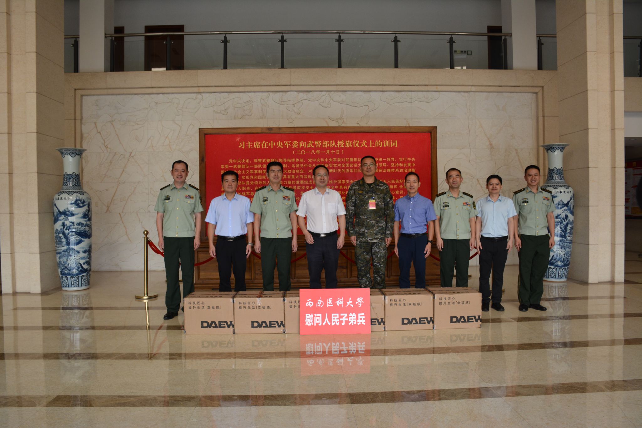 为弘扬拥军优属光荣传统,加强军校共建,巩固发展新时代军民团结,9月24日上午,学校党委常委、副校长聂敏海率队赴武警泸州支队开展走访慰问活动,双方进行亲切的交流与座谈,共叙鱼水情谊,共话双拥共建,学校武装部全体同志参加。