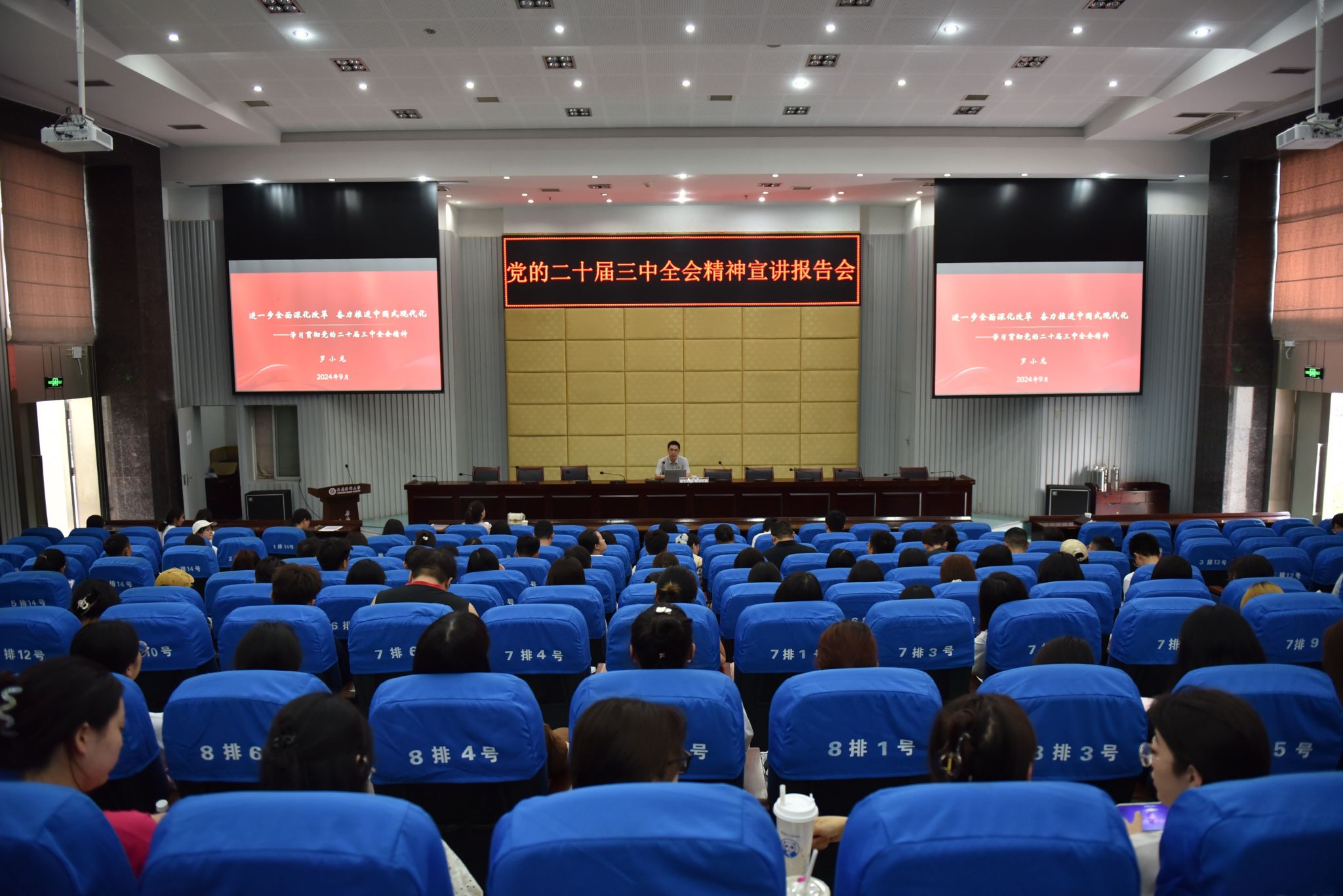 为深入学习宣传贯彻党的二十届三中全会精神,把全校师生的思想和行动统一到全会决策部署上来,把力量凝聚到全会的各项任务上来,按照泸州市委宣传部统一部署,9月25日,学校举办党的二十届三中全会精神宣讲报告会,邀请泸州市委宣讲团第十分团成员罗小龙教授作题为《进一步全面深化改革,奋力推进中国式现代化》专题宣讲。学校党员干部、教职工代表、学生代表约200人参加。