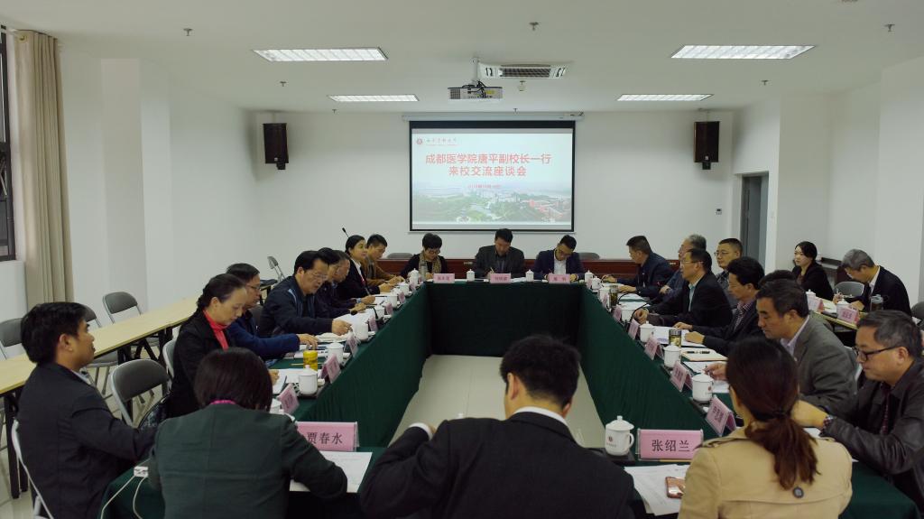 10月15日下午,成都医学院副院长唐平一行14人来校交流。交流座谈会在城北校区档案馆底楼会议室召开,双方就校院两级管理等工作进行了探讨。校长何延政、副校长彭钢,相关职能部门负责人参加了会议。会议由彭钢主持。
