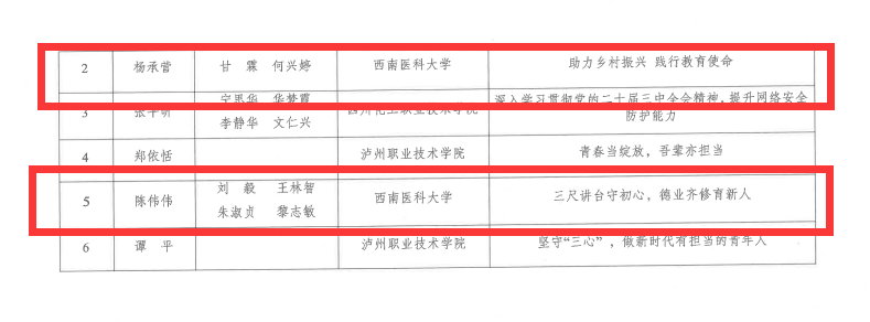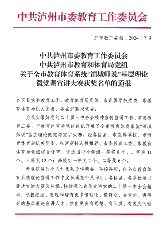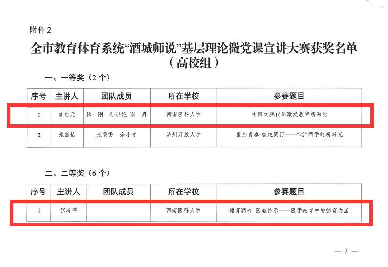 近日,市委教育工委、市教体局党组公布了全市教育系统“酒城师说”基层理论微党课宣讲大赛获奖名单,教辅后勤党委李启元主讲的《中国式现代化激发教育新动能》获一等奖,临床医学院·附属医院党委张玲萍主讲的《德育润心 医道传承——医学教育中的德育内涵》、临床医学院·附属医院党委杨承营主讲的《助力乡村振兴 践行教育使命》、法学院党委陈伟伟主讲的《三尺讲台守初心,德业齐修育新人》3个作品获二等奖。