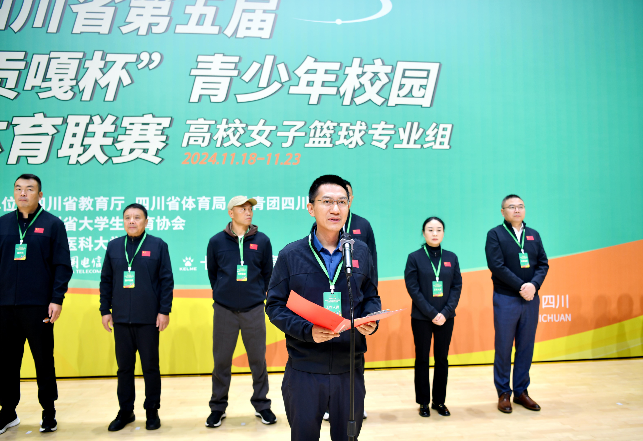 学校党委常委、副校长、体委主任江涌,共青团四川省委宣传部干部黄丹,四川省大学生体育协会副会长 毛晓峰,四川省大学生体育协会竞训部部长吕志刚,学校体育学院党委书记邹小萍,赛事纪律监督吴晓福,比赛监督蒲实、文波、黄德建,技术代表李晓兵、朱建伟,裁判长侯磊及各参赛队领队、教练员、运动员出席开赛仪式。仪式由学校体育学院院长王定宣主持。