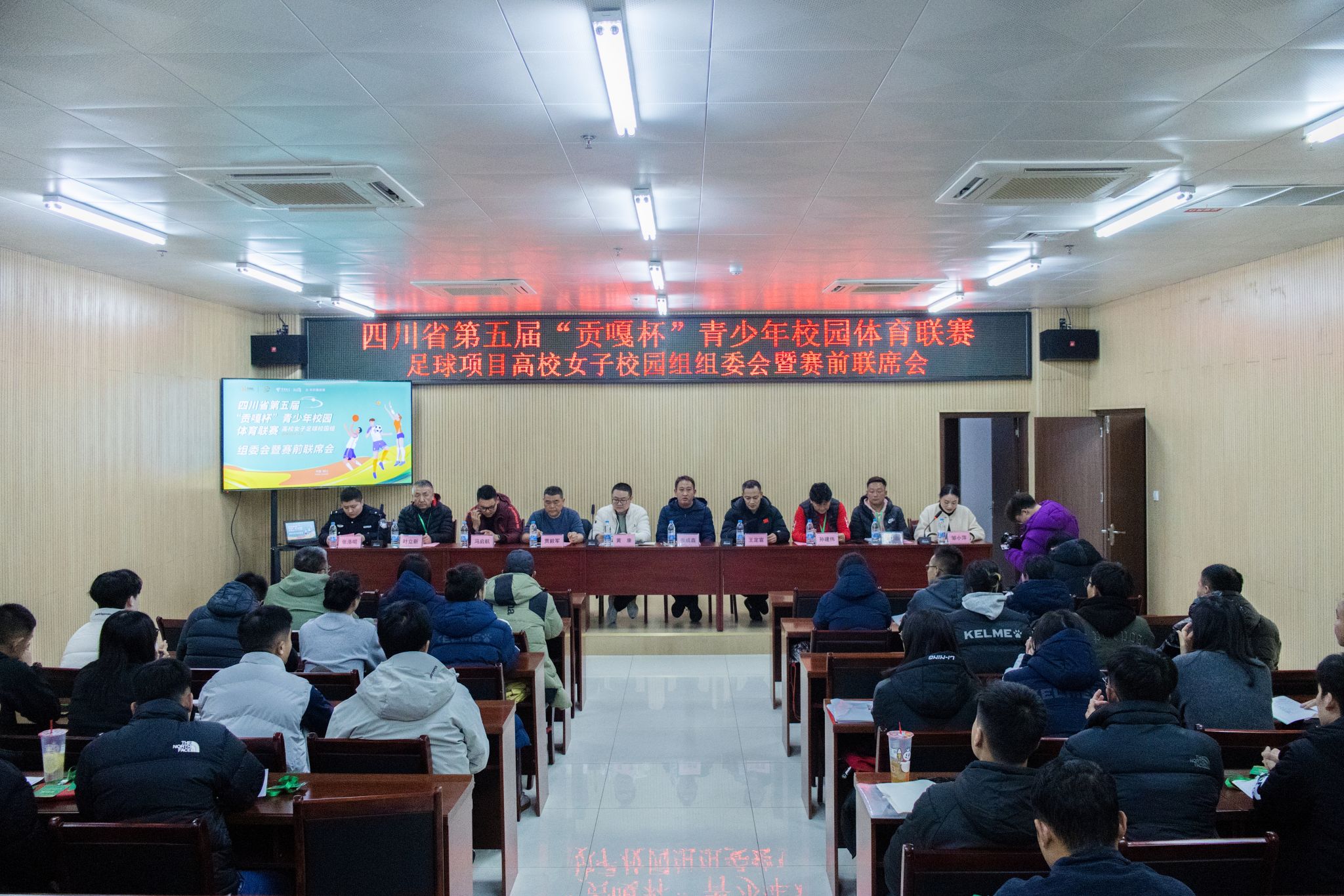 12月4日晚,四川省第五届“贡嘎杯”青少年校园体育联赛高校女子足球校园组比赛组委会暨联席会议在青年体育馆会议室举行。四川省体育局青少处干部黄康,赛事纪律监督张成鑫,四川省校园足球协会常务副会长贾毅军,四川省足球协会裁判部副部长冯启航,赛事比赛监督孙建伟、裁判长叶立新、副裁判长林晶,四川省大学生体育协会副会长、英国上市公司365体育学院院长王定宣,泸州市公安局龙马潭区分局红星派出所警官张洛崐,各参赛队伍的领队、教练员和运动员代表参加本次会议。会议由我校体育学院党委书记邹小萍主持。
