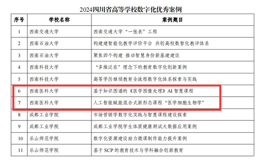 近日,四川省高等教育学会教育信息化专业委员会公布了2024年四川省高等学校数字化优秀案例,全省高校共36个案例入选,我校《基于知识图谱的<医学图像处理>AI智慧课程》《人工智能赋能混合式新形态课程“医学细胞生物学”》入选。