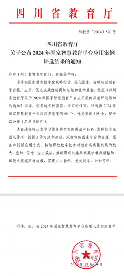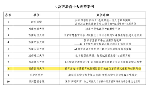 近日,四川省教育厅公布了2024年国家智慧教育平台应用案例入选名单,我校《教育出海:智慧教育赋能国际医学教育改革的模式建构与创新路径》案例入选“高等教育十大典型案例”,这标志着我校在智慧教育领域取得的显著成果,为全国教育数字化转型提供了可借鉴的范例。