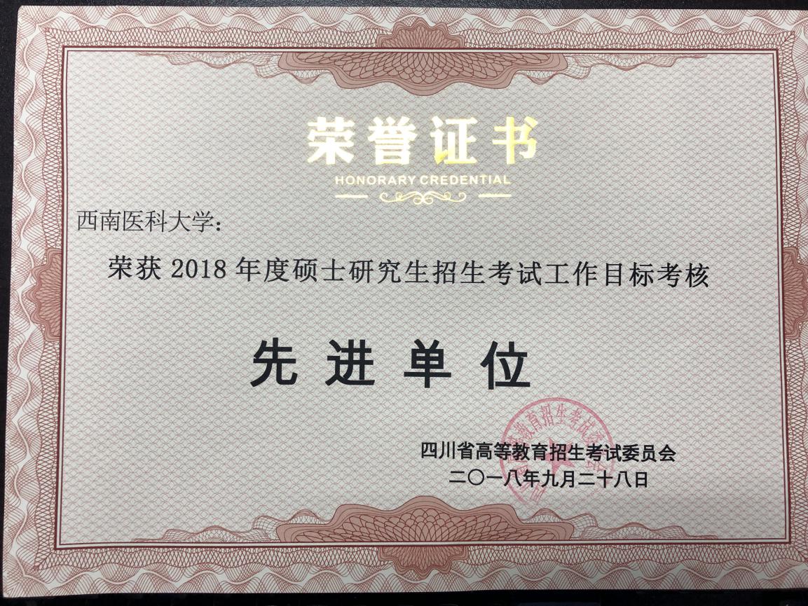 近日,四川省教育考试院组织召开四川省2019年研究生招生工作会议。我校2018年硕士研究生招生考试工作被四川省高等教育招生考试委员会授予“2018年度硕士研究生招生考试工作目标考核先进单位”称号。至此,我校已连续15年获得四川省研究生招生工作先进表彰。