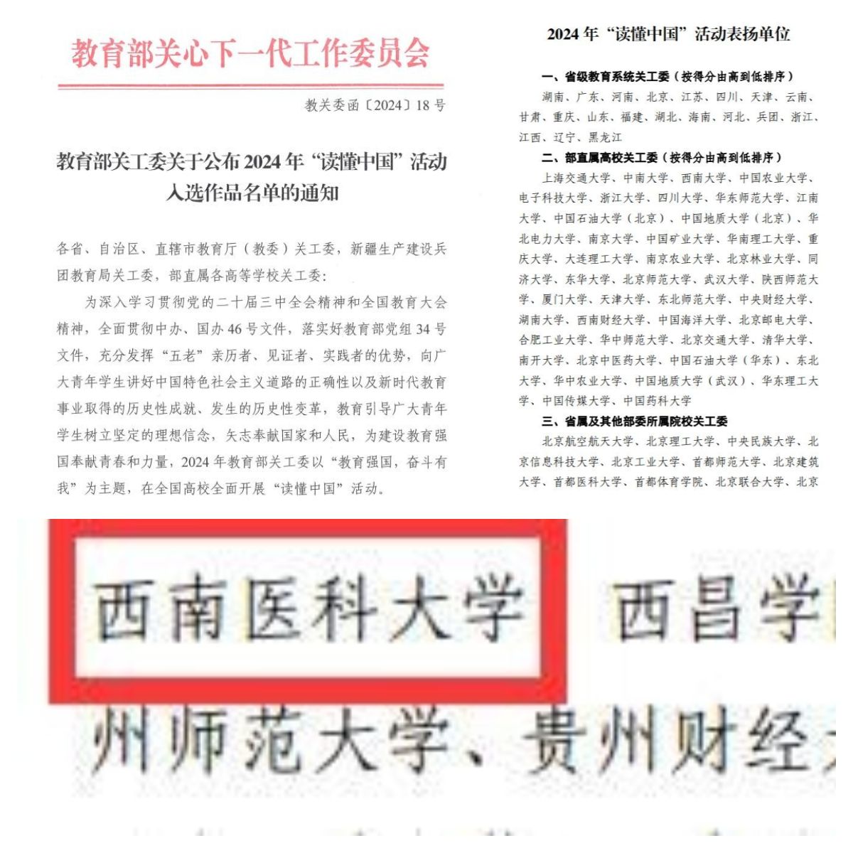 根据《教育部关工委关于公布2024年“读懂中国”活动入选作品名单的通知》(教关委函〔2024〕18号),学校关工委荣获“2024年‘读懂中国’活动表扬单位”,这是学校关工委自2020年组织开展“读懂中国”活动以来,首次荣获该项荣誉。