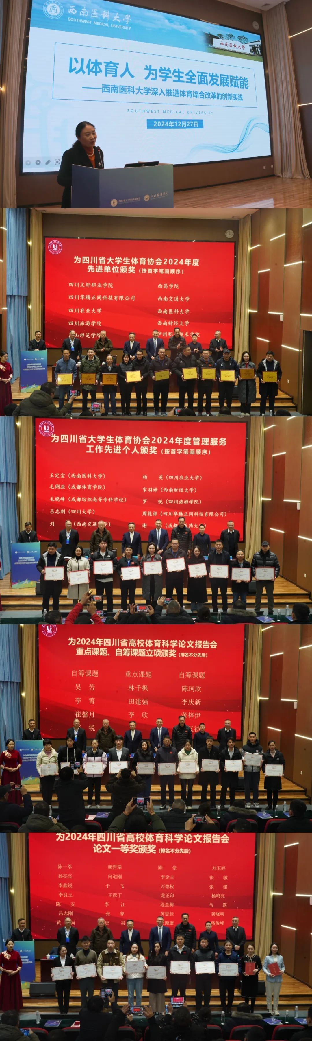 12月26-28日,2024年四川省高校体育科学论文报告会暨四川省大学生体育协会年会在四川旅游学院召开。本次会议由四川省教育厅主办,四川省大学生体育协会执行,四川旅游学院承办。我校受邀参加年会,并获多项荣誉。