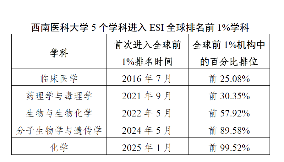 1月9日,科睿唯安(Clarivate Analytics)发布了2025年1月的ESI最新数据。学校化学学科首次进入ESI学科全球排名前1%。截止目前,学校已有5个学科进入ESI学科全球排名前1%,ESI学科数量及综合被引均居西部医药类大学第6名,彰显了学校在学术研究领域的强劲实力和影响力、竞争力。