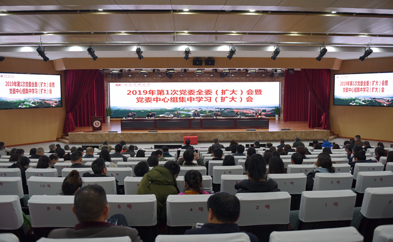 1月16日下午,学校2019年第1次党委全委(扩大)会在城北校区德诚楼学术报告厅召开。全体校领导、“两委”委员、全体处科级干部、校本部党支部书记及教研室(实验室)主任、三附院相关人员参加了会议。党委书记廖斌同志主持会议。