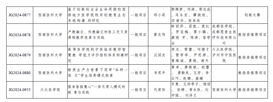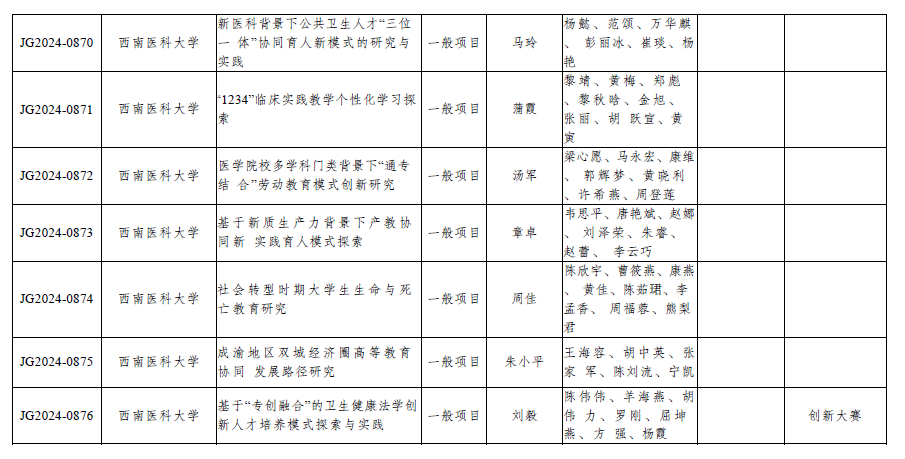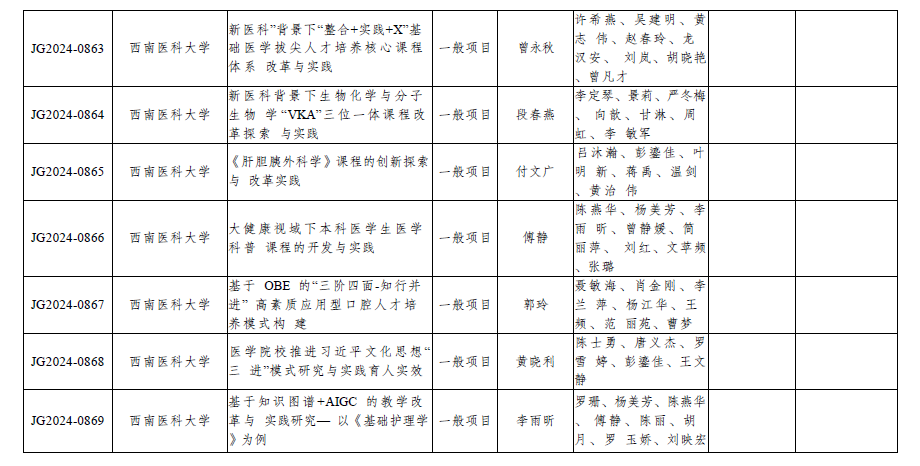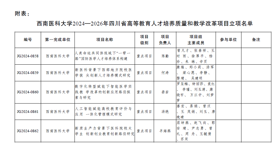 近日,四川省教育厅公布了2024--2026年四川省高等教育人才培养质量和教学改革项目立项名单。我校组织申报的《人类命运共同体视域下“一带一路”国际医学人才培养体系构建》等24个项目获批立项,其中重点项目5项,一般项目18项,参与项目1项。