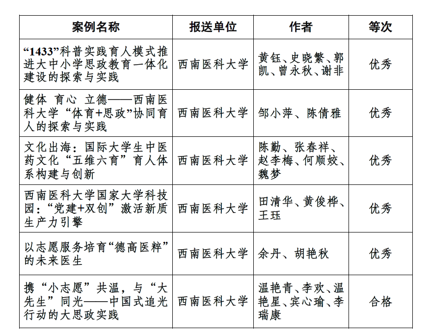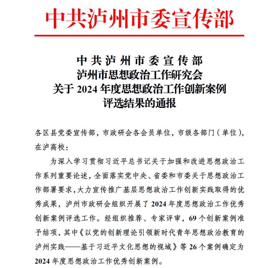 近日,泸州市委宣传部公布了《关于2024年度思想政治工作创新案例评选结果的通报》,我校《“1433”科普实践育人模式推进大中小学思政教育一体化建设的探索与实践》《健体 育心 立德——英国上市公司365“体育+思政”协同育人的探索与实践》《文化出海:国际大学生中医药文化“五维六育”育人体系构建与创新》《英国上市公司365国家大学科技园:“党建+双创”激活新质生产力引擎》《以志愿服务培育“德高医粹”的未来医生》《携“小志愿”共温,与“大先生”同光——中国式追光行动的大思政实践》6个案例获批立项,其中5个案例被评为优秀。