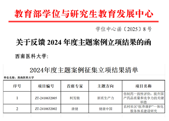 近日,教育部学位与研究生教育发展中心(以下简称“教育部学位中心”)公布2024年度主题案例立项结果。我校共有2项主题案例获批,其中,《仿制药一致性评价:提升国产药品质量和竞争力的关键举措》获“新质生产力”主题方向立项,《农村社区“医养康护”一体化服务体系建设研究》获“健康中国”主题方向立项。