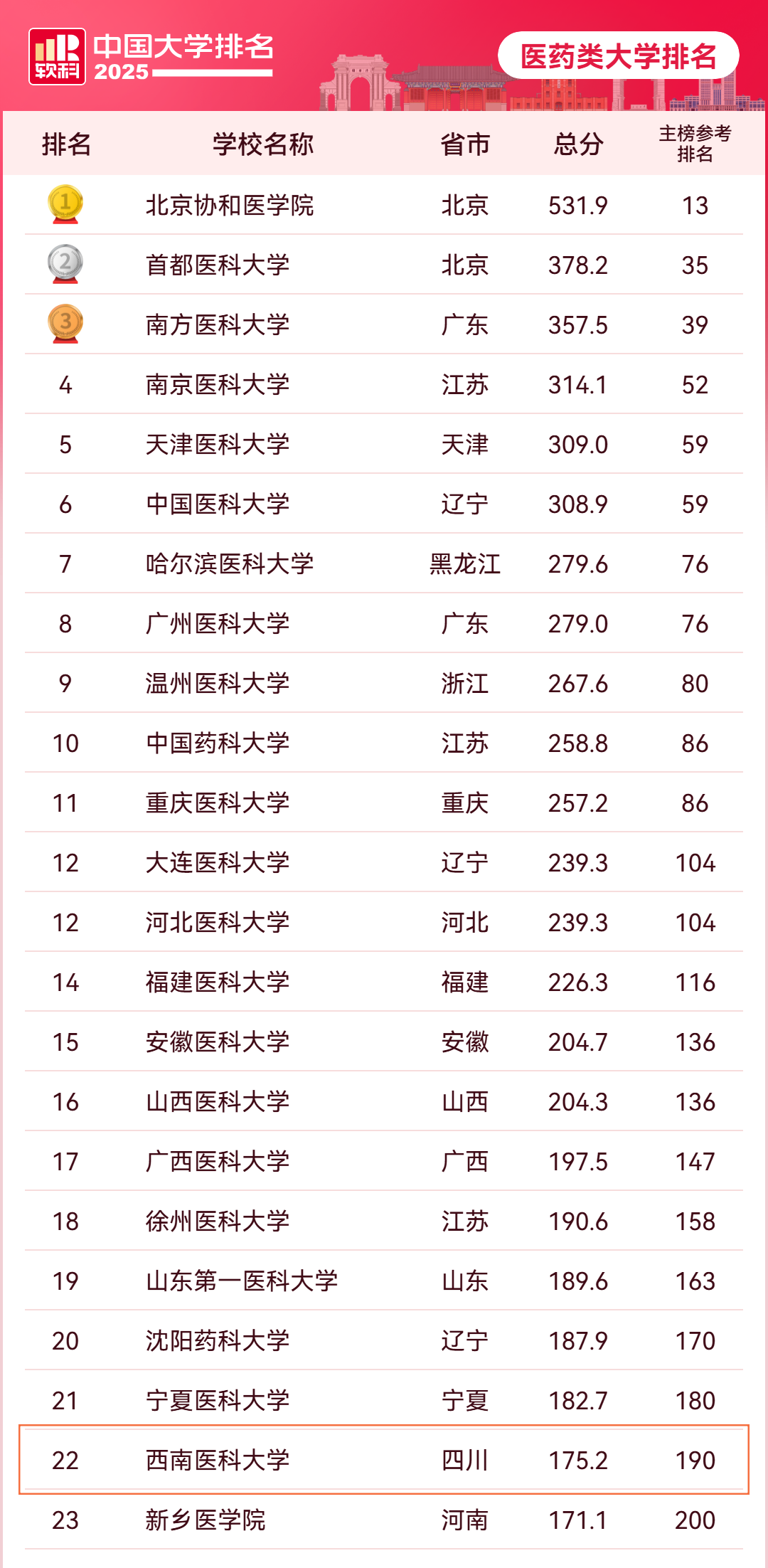 4月15日,高等教育专业评价机构软科发布了“2025软科中国大学排名”,学校在中国医药类大学排名中位列第22名(排名对象59所),主榜参考排名第190名。根据排名统计,学校在西部医药类大学中位列第4名。
