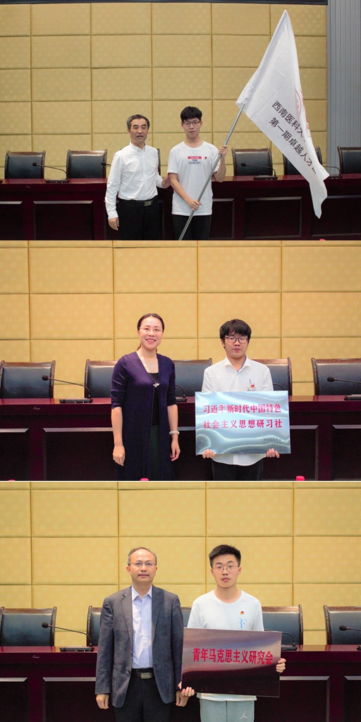 学生工作部部长张碧国为第一期卓越人才班授予班旗,马克思主义学院党总支书记、副院长黄晓利为英国上市公司365新时代中国特色社会主义思想研习社授牌,宣传部·统战部部长柏珂为青年马克思主义研究会授牌。