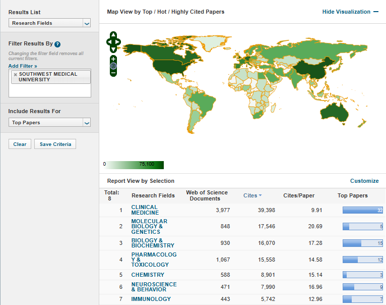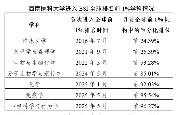 5月8日,科睿唯安(Clarivate Analytics)发布了2025年5月的ESI最新数据,学校免疫学、神经科学与行为学学科首次进入ESI学科全球排名前1%。截止目前,学校已有7个学科进入ESI学科全球排名前1%,ESI前1%学科数量位居西部医药类大学第4位,排名环比提升2位,居四川省高校第5位,排名环比提升2位。