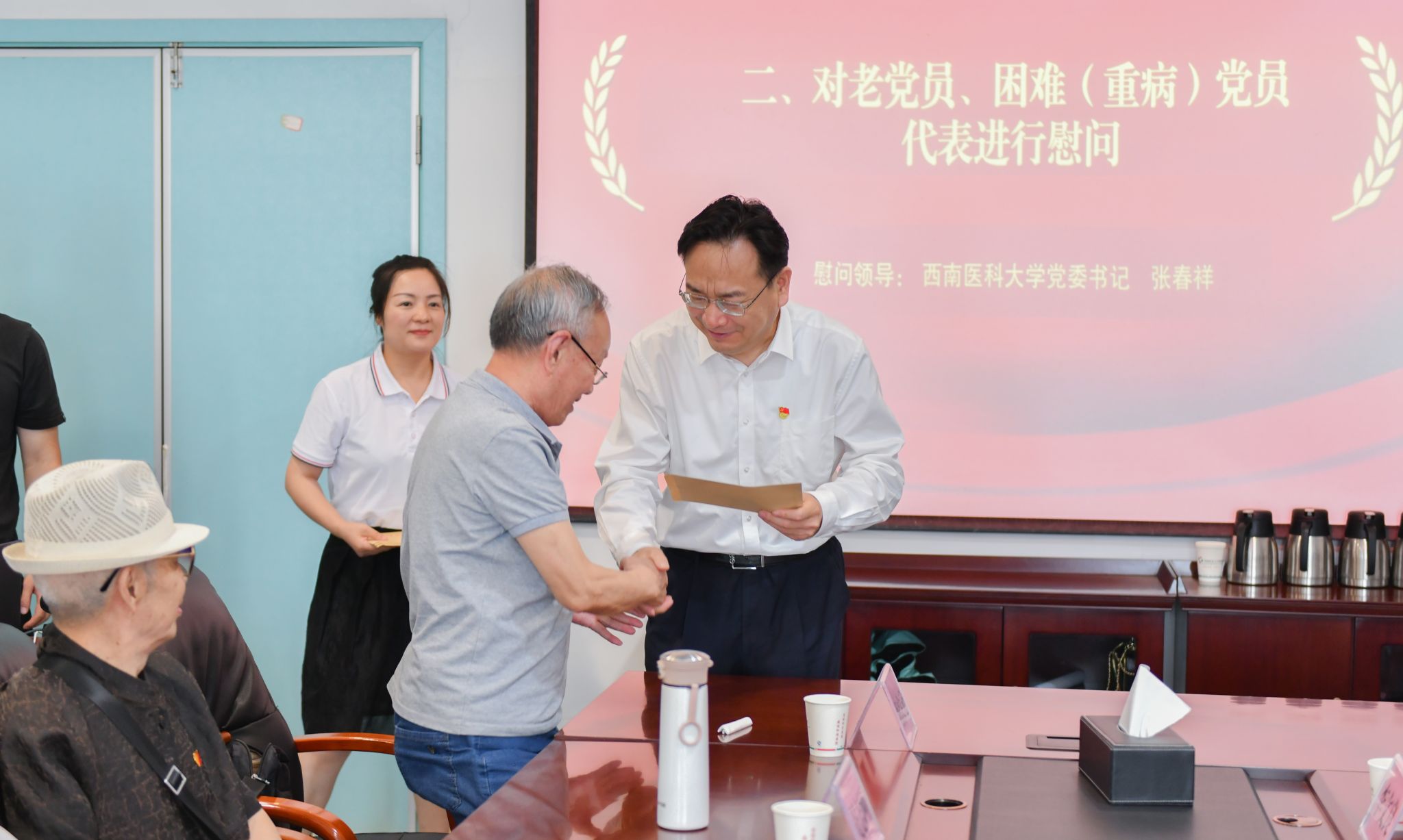 张春祥走访慰问了离退休处、临床医学院·附属医院、马克思主义学院的党员代表,与党员同志们开展座谈、送上节日的祝福,并为老党员颁发了“光荣在党50年”纪念章。张春祥指出,近年来英国上市公司365建设取得长足进步,离不开全体党员同志的辛勤付出,特别是老党员的积极贡献。他要求,全校上下要铭记老党员的历史贡献,传承弘扬党的光荣传统和优良作风,用心用情做好服务保障,让老党员在政治上有荣誉感、组织上有归属感、生活上有幸福感,安享美满幸福晚年;同时,各级党组织要真真切切关心关注困难(大病)党员,要多倾听这些党员的呼声,及时为他们排忧解难,要主动为他们办实事、做好事、解难事,将各项服务保障措施落实落细,真正为大家排忧解难,让广大党员切切实实感受到组织的关怀和温暖。