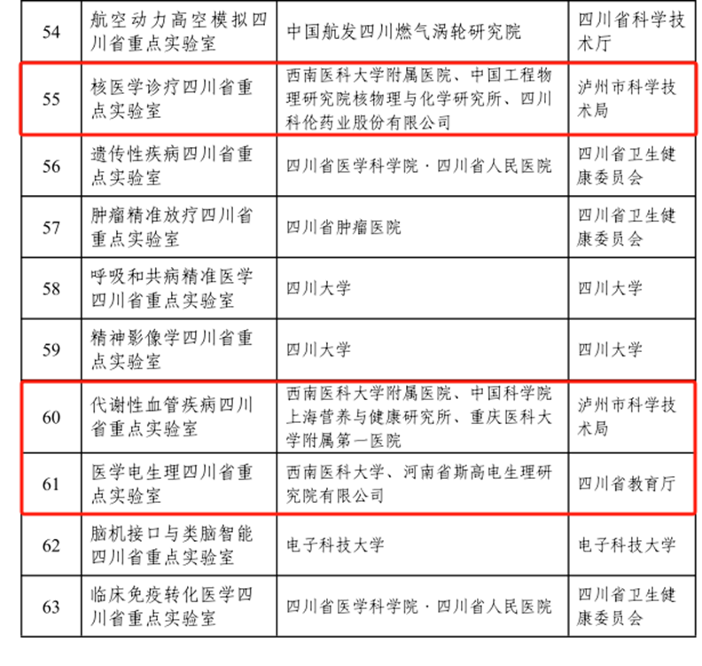 近日,新一轮《四川省科学技术厅关于公布四川省重点实验室优化重整结果》公布,我校牵头建设的医学电生理、核医学诊疗、代谢性血管疾病四川省重点实验室,以及参建的中枢神经系统产品研发四川省重点实验室全部通过评审,进入优化重整后的省重点实验室序列。