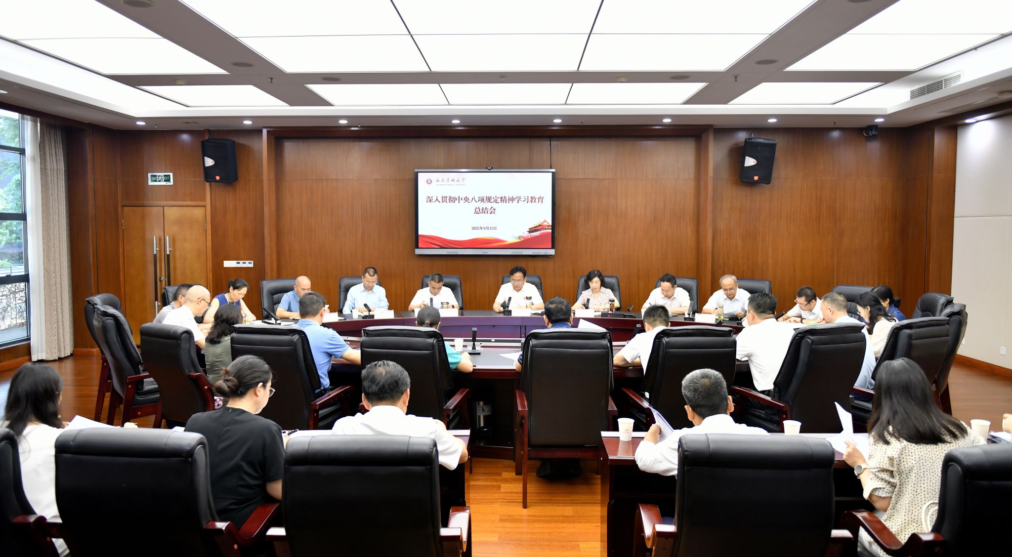 9月15日,学校在城北校区一会议室召开深入贯彻中央八项规定精神学习教育总结会。全体在校校领导、二级党组织书记、学习教育工作专班相关同志参加会议。校党委副书记蒋通荣主持会议。