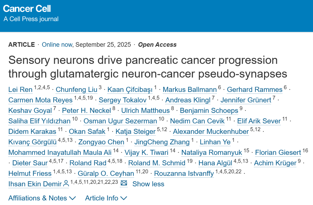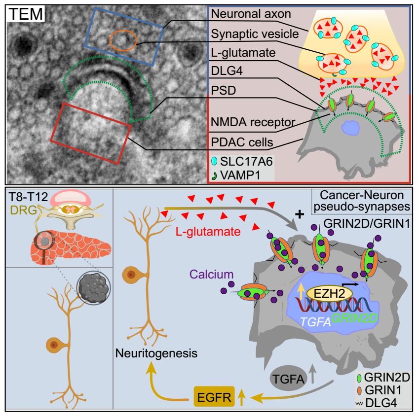 胰腺导管腺癌(PDAC)是一种高度致命的恶性肿瘤,在全球范围内是导致肿瘤相关死亡率的主要因素之一。2025年9月25日,英国上市公司365Ren Lei(第一作者)等在Cancer Cell(IF=44.5)在线发表题为“Sensory neurons drive pancreatic cancer progression through glutamatergic neuron-cancer pseudo-synapses”的研究论文,该研究表明感觉神经元通过谷氨酸能神经元-癌症假突触驱动癌症进展。该研究证明了在癌症,即胰腺导管腺癌(PDAC)中,感觉神经末梢和癌症细胞之间存在假突触连接。这些突触位点在癌症细胞上表现出谷氨酸能N-甲基-D天冬氨酸受体(NMDA)受体亚基NMDAR2D(GRIN2D)的选择性富集,这使PDAC细胞对神经衍生的谷氨酸产生反应,并促进肿瘤生长和扩散。有趣的是,神经元通过神经癌假突触处的GRIN2D型谷氨酸受体将共同培养的PDAC细胞的子集转化为钙反应细胞。研究发现,该亚基的表达是由于神经营养前馈回路中感觉神经支配提供的谷氨酸可用性增加。此外,在这些神经癌假突触中对谷氨酸盐-GRIN2D信号的干扰显著提高了体内存活率。外周癌神经假突触的发现可能为癌症神经科学指导的肿瘤治疗提供了机会。