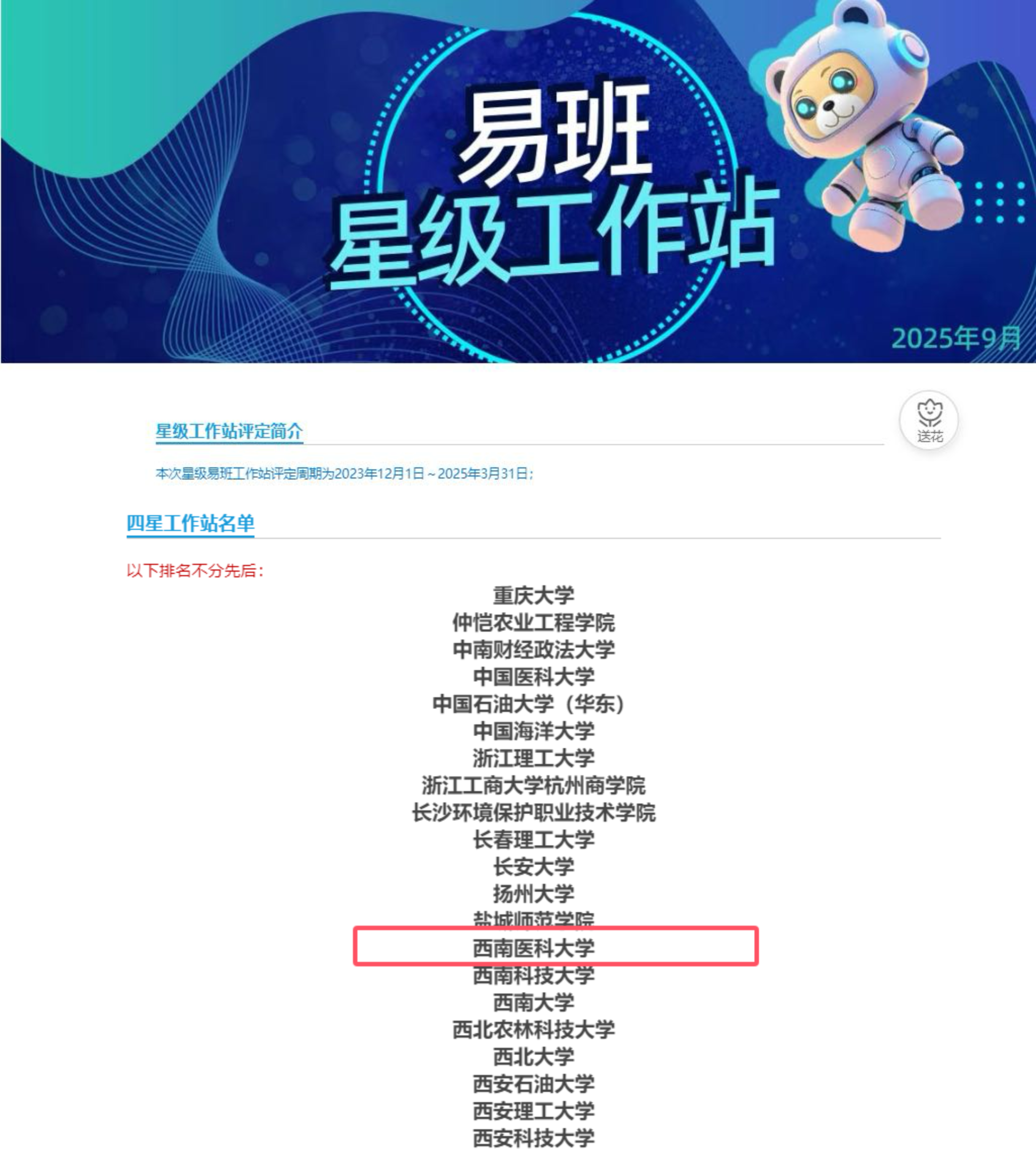 近日,教育部易班发展中心公布2025年度全国易班星级工作站名单,我校易班学生工作站凭借扎实成效与突出表现,成功获评“全国四星级工作站”。